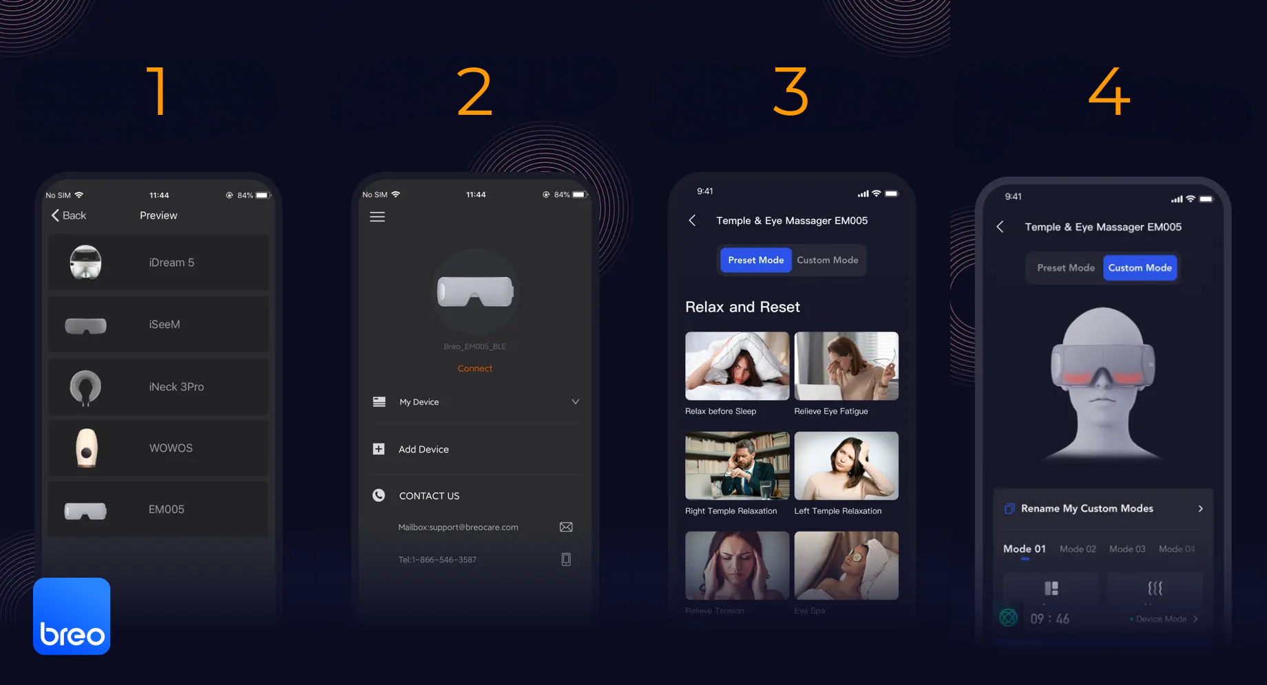 Jego obsługa jest całkowicie intuicyjna i można ją dostosować za pomocą aplikacji . Urządzenie może również odtwarzać ulubioną muzykę podczas zabiegu za pośrednictwem aplikacji Breo, przesyłając ścieżkę dźwiękową do masażera.